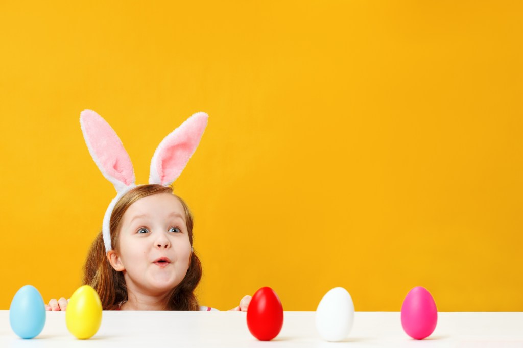 Let the child have fun preparing Bunny Pears for the family. On small plates, place a canned pear half with the narrow end at the top. Have the child press two raisins into the pears as eyes. Add a cinnamon red hot for the nose and two almonds as the bunny’s ears. Add a spoon of cottage cheese to the larger end for the cottony tail. Refrigerate the pears until they’re ready to eat.