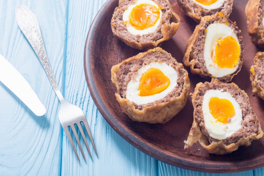 Wrap your hard-boiled eggs in sausage (turkey sausage is an option if you’re trying to cut calories), roll them in seasoned breading and then deep fry them. They can be served at room temperature or warm. These are often served for breakfast or brunch.