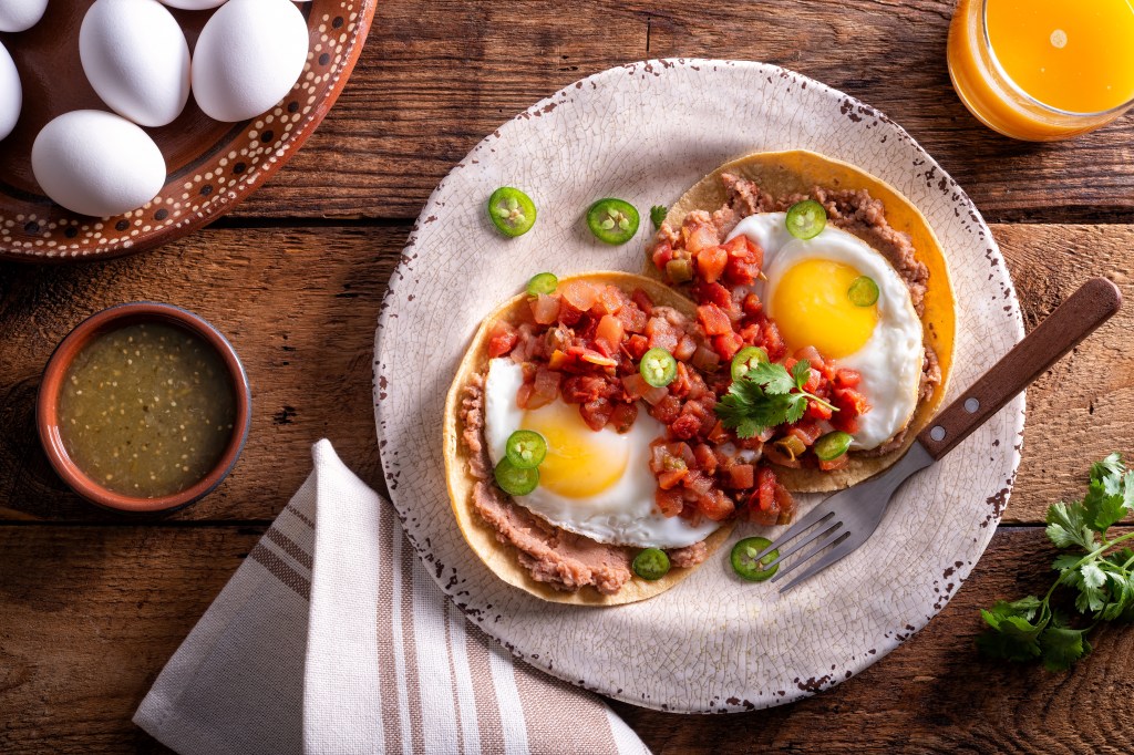 To serve, add two tortillas to each plate. Top with 2 fried eggs, a few spoons of the tomato sauce and a strip of bacon.